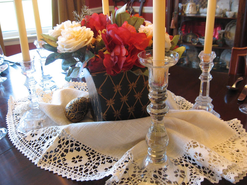 ReplyDeleteYour table is beautiful. I love the china pattern and I always love when you use your vintage linens. The centerpiece is just lovely, and the egg is gorgeous!